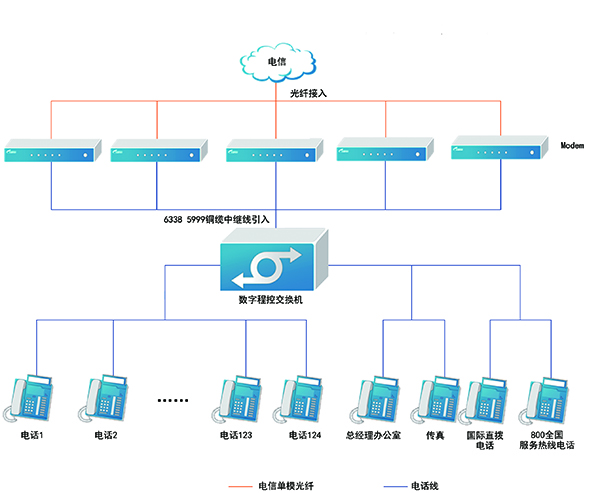 根據(jù)以上要求,公司語(yǔ)音通信系統(tǒng)采用集團(tuán)電話數(shù)字程控交換機(jī)實(shí)現(xiàn)多終端語(yǔ)音通信功能。根據(jù)綜合布線子系統(tǒng),本系統(tǒng)設(shè)計(jì)滿足120個(gè)終端使用,系統(tǒng)接入6部普通外線號(hào)碼及4部專用語(yǔ)音外線號(hào)碼,通過光纖解調(diào)器統(tǒng)一接入程控交換機(jī)。系統(tǒng)選用擴(kuò)容型插卡結(jié)構(gòu)數(shù)字程控機(jī),配置為8外線104分機(jī),交換機(jī)所有模塊均采用插卡結(jié)構(gòu),在維護(hù)、升級(jí)機(jī)器中,分機(jī)卡與外線卡通用(8外線一個(gè)卡/8分機(jī)一個(gè)卡),擴(kuò)容方便,節(jié)約成本,系統(tǒng)可擴(kuò)容至16外線128分機(jī),滿足擴(kuò)展性的要求。