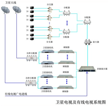 衛(wèi)星電視節(jié)目頻道根據(jù)實(shí)際情況選擇衛(wèi)星接收電視節(jié)目內(nèi)容,通過調(diào)制、解調(diào)后混合輸入傳輸干線。