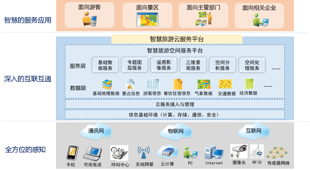 智慧旅游緊扣“旅游信息化、景區(qū)智慧、應(yīng)用智能化”這一主題,以信息智能化為突破口,實現(xiàn)智慧、智能化、決策科學(xué)化的旅游管理體系,構(gòu)建智慧智能指揮調(diào)度中心體系、景區(qū)管理與生態(tài)保護(hù)體系和現(xiàn)代旅游服務(wù)體系,從監(jiān)測、預(yù)警、分析、決策、指揮、評估和善后處理的全過程,以流程化管理為支撐,建立起了統(tǒng)一指揮、功能齊全、先鋒可靠、反應(yīng)靈敏、便捷高效的管理和指揮平臺,實現(xiàn)了旅游管理、指揮決策、便民服務(wù)三位一體、平戰(zhàn)結(jié)合的綜合智慧體系。