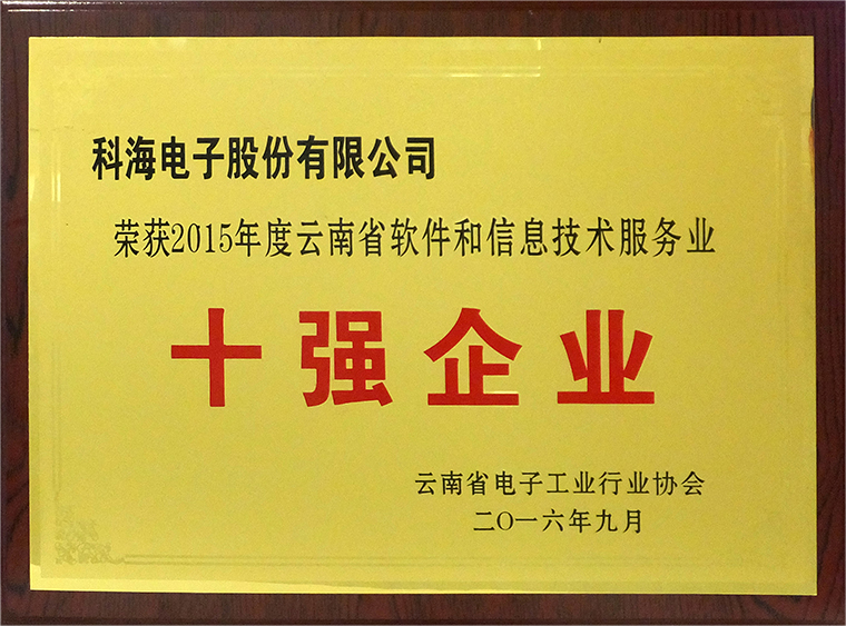 九月,一個收獲的季節(jié),公司榮獲了云南省電子工業(yè)行業(yè)協(xié)會頒發(fā)的“2015年度云南省軟件和信息技術服務業(yè)十強企業(yè)”的榮譽稱號。