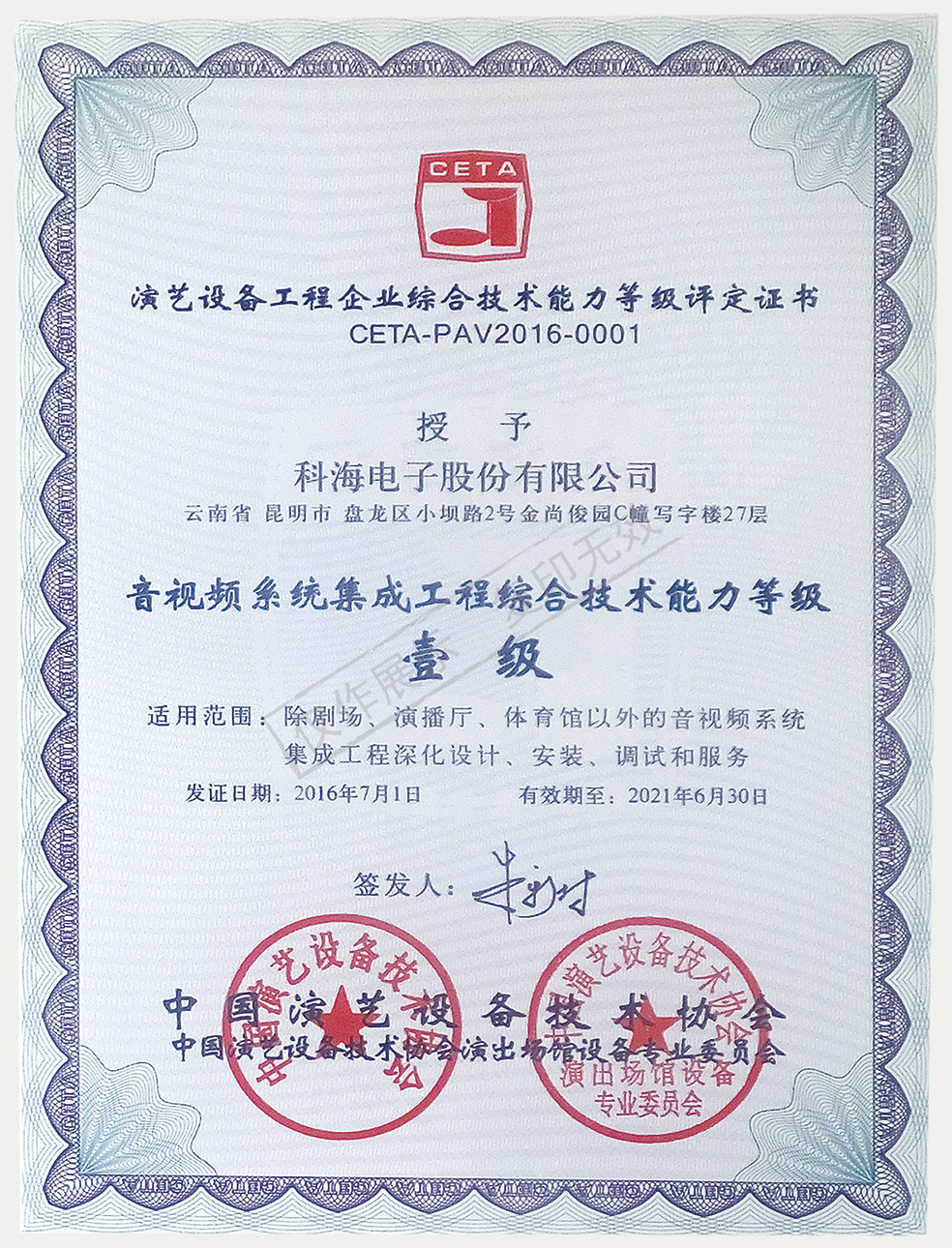 音視頻系統(tǒng)集成工程綜合技術(shù)能力等級(jí)壹級(jí)
